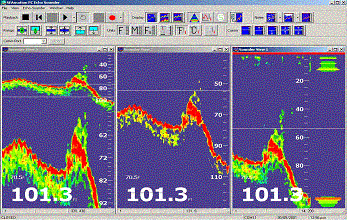 The amazing, new SounderPC utilizes DSP technology to dramatically improve sensitivity in a cost effective and reliable manner. The SounderPC does very little filtering, mostly amplification then transmits data straight into the computer as a series of 1's and 0's. The narrow band filtering is done in software which does not require an AGC or a lot of expensive components and doesn't drift with temperature or vibration and requires no factory adjustments. You can use smaller (cost effective) transducers and see smaller targets with higher resolution. The SounderPC is extremely accurate at high boat speeds because it is unaffected by ringing due to transducer slap & buffeting. The ·smart· DSP technology actually rejects signals caused by buffeting by not transmitting data at the transducer's natural ringing frequency and only responding to signals at the transmitted frequency. Note that ALL standard analog depth sounders suffer from transducer ringing due to slap & buffeting. It's impossible to avoid this in analog AGC thresholding type systems. Once locked onto the bottom, the SounderPC·s smart DSP technology is practically unaffected by other nearby depth sounders (even at the same frequency) for the same reasons as above. Because the SounderPC uses less power, it also has less effect on other nearby depth sounders. At depths to about 300 feet the SounderPC only uses about 1.3 watts, which is why you can't hear transducer "click" of older technology. (click here for Sounder PC Specifications)